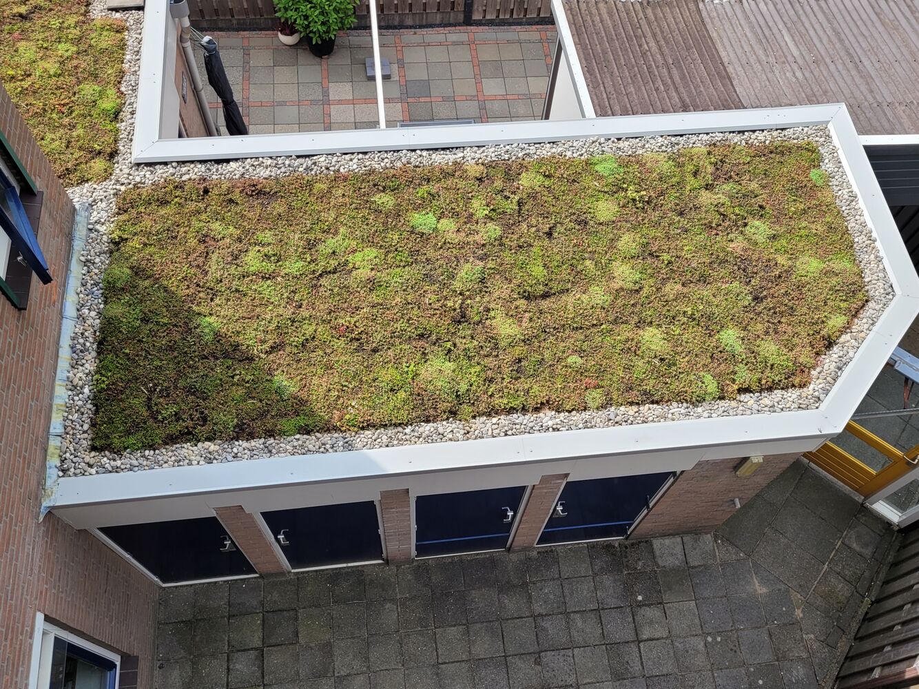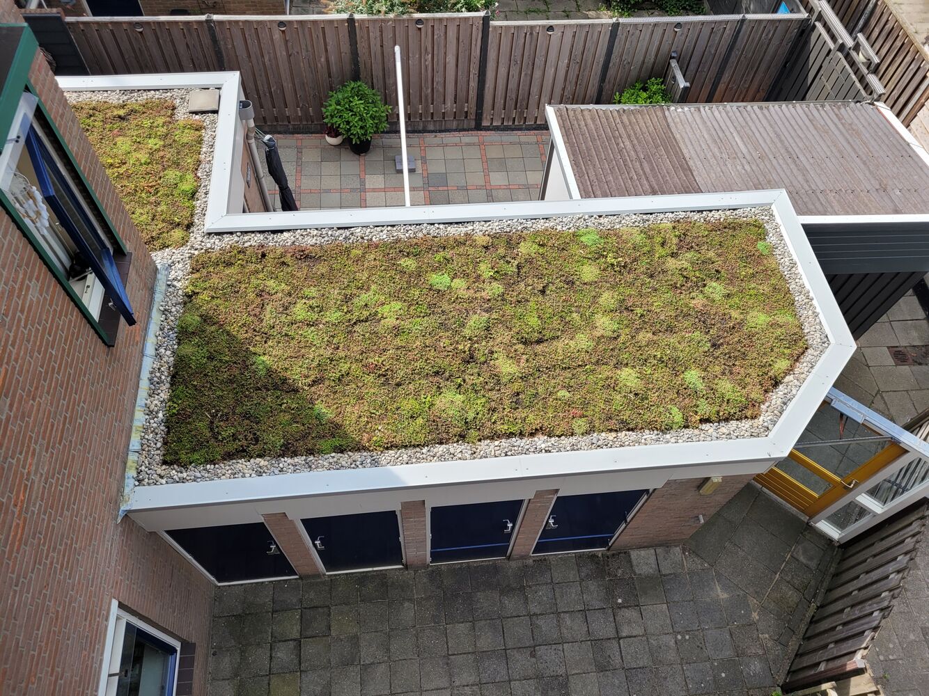 Dit zijn de eerste kleine groene daken die we op deze manier aanleggen, en het is een positieve stap voor ons en de omgeving. Een groen dak bestaat uit planten bovenop het bestaande dak. Dit heeft veel voordelen. Het groen absorbeert een deel van het water en vertraagt de afvoer, zodat regenwater minder snel naar het riool stroomt. Het groene dak trekt ook insecten aan, wat goed is voor de diversiteit van planten en dieren in de buurt. Zo wordt de leefomgeving gezonder en levendiger. Bovendien voegt het kleur toe aan de buurt. De planten beschermen het dak ook tegen zonlicht en weer, wat de levensduur van het dak verlengt. Dit betekent minder onderhoud en kosten. Kortom, we zijn blij met deze groene toevoegingen!
